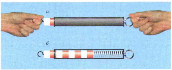Прибор для измерения силы называют динамометром. На рис. 16.2, а изображён школьный динамометр, а на рис. 16.2, б — его устройство: видно, что внутри динамометра находится пружина.