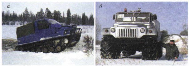 Рис. 18.2. Вездеход на гусеницах (а) и на больших колёсах (б). На фотографии справа рядом с вездеходом стоит человек, провалившийся в рыхлый снег