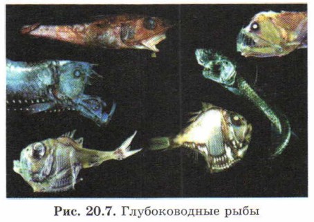 Даже на этой глубине учёные обнаружили рыб — некоторые из них изображены на рис. 20.7. Привлекательными их не назовёшь, но красота этим рыбам ни к чему: на такой глубине царит вечная тьма. Главное для них — выдержать чудовищное давление воды.