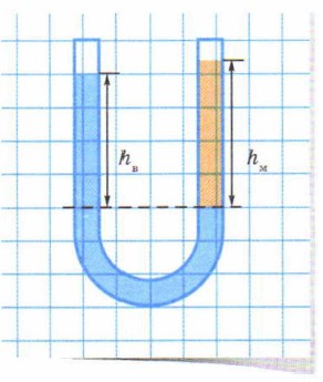 В U-образной трубке находятся вода и масло (рис. 20.9). Высота слоя масла равна 10 см. Насколько уровень поверхности масла выше уровня поверхности воды? Будем считать, что плотность масла равна 900 кг/м3.