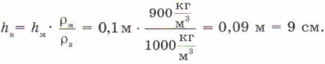 Р е ш е н и е. На уровне поверхности раздела масла и воды (отмеченном пунктирной линией на рис. 20.9) давление одинаково (иначе вода в нижней части трубки перетекала бы в сторону меньшего давления). Следовательно, давление, создаваемое слоем масла, равно давлению, создаваемому слоем воды над отмеченным уровнем. Если обозначить высоту слоя масла hм, а указанного слоя воды hв, то получим ρмghм = ρвghв, где ρм и ρв — плотность масла и воды соответственно. Отсюда то есть уровень жидкости выше в сосуде, содержащем жидкость с меньшей плотностью. Найдём разность уровней жидкостей. Из выведенной формулы получаем
