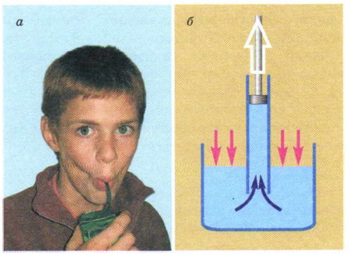 Когда вы пьёте сок через трубочку (рис. 21.4, а), вы тоже втягиваете щёки, уменьшая давление во рту. И давление атмосферы, действуя на поверхность сока в пакете, толкает сок в трубочку.