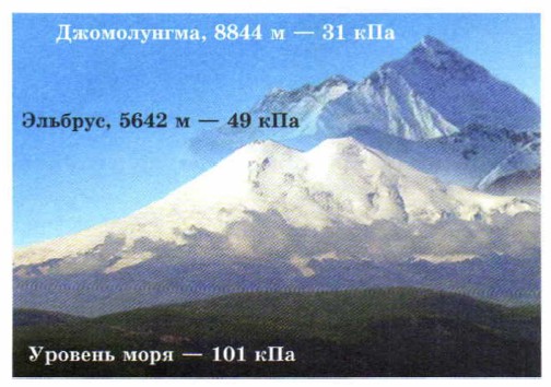 § 21. Атмосферное давление Как зависит атмосферное давление от высотыПри подъёме давление атмосферы уменьшается, потому что чем выше мы находимся, тем меньше высота столба воздуха над нами. Для небольших высот (десятки и даже сотни метров) уменьшение давления с высотой можно приближённо рассчитать, принимая плотность воздуха ρвозд постоянной (на уровне моря — около 1,3 кг/м3). Это означает, что при подъёме на высоту h давление воздуха уменьшается на ρвоздgh. Отсюда следует, что при подъёме, например, на высоту 10 м (трёхэтажный дом) давление уменьшается примерно на 130 Па. Это немного меньше 1 мм рт. ст. Для больших высот, например в горах, надо учитывать, что с увеличением высоты плотность воздуха уменьшается. Поэтому с увеличением высоты давление воздуха уменьшается медленнее, чем если бы плотность воздуха оставалась постоянной. На рис. 21.7 приведены значения давления на вершине Эльбруса — самой высокой горы в Европе (Россия) и на вершине Джомолунгмы — самой высокой горы в мире (Китай). Мы видим, что на высоте около 9 км давление воздуха составляет примерно 30 % от нормального атмосферного давления.