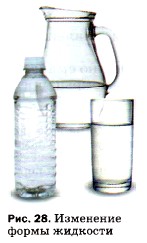 В отличие от твёрдых тел жидкости легко меняют свою форму. Они принимают форму сосуда, в котором находятся. Например, вода, наполняющая кувшин, имеет форму кувшина. Налитая же в стакан (бутылку), она принимает форму стакана (бутылки) (рис. 28). Но, изменяя форму, жидкость сохраняет свой объём. В обычных условиях только маленькие капельки жидкости имеют свою форму — форму шара. Это, например, капли дождя или капли, на которые разбивается струя жидкости. На свойстве жидкости легко изменять свою форму основано изготовление предметов из расплавленного стекла (рис. 29). Жидкости легко меняют свою форму, но сохраняют объём.
