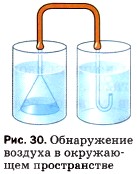 Воздух, которым мы дышим, является газообразным веществом, или газом. Поскольку большинство газов бесцветны и прозрачны, то они невидимы. Присутствие воздуха можно почувствовать, стоя у открытого окна движущегося поезда. Его наличие в окружающем пространстве можно ощутить при возникновении в комнате сквозняка, а также доказать с помощью простых опытов. Если стакан перевернуть вверх дном и попытаться опустить его в воду, то вода в стакан не войдёт, поскольку он заполнен воздухом. Теперь опустим в воду воронку, которая соединена резиновым шлангом со стеклянной трубочкой (рис. 30). Воздух из воронки начнёт выходить через эту трубочку.