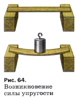 На книгу, лежащую на столе, также действует сила тяжести, но книга не проваливается сквозь стол, а находится в покое. Подвесим тело на нити. Оно падать не будет. Почему же покоятся тела, лежащие на опоре или подвешенные на нити? По-видимому, сила тяжести уравновешивается какой-то другой силой. Что же это за сила и как она возникает? Проведём опыт. На середину горизонтально расположенной доски поставим гирю (рис. 64). Под действием силы тяжести гиря начнёт двигаться вниз и прогнёт доску, т. е. доска деформируется. При этом возникает сила, с которой опора (доска) действует на тело, расположенное на ней. Из этого опыта можно сделать вывод, что на гирю, кроме силы тяжести, направленной вертикально вниз, действует ещё какая-то другая сила. Эта сила направлена вертикально вверх. Она и уравновесила силу тяжести. Эту силу называют силой упругости.