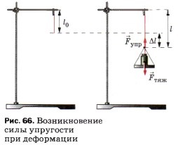 Чем сильнее прогибается опора (доска), тем больше сила упругости. Если сила упругости становится равной силе тяжести, действующей на тело, прогибание доски прекращается. Теперь подвесим тело на нити. Нить (подвес) растягивается (рис. 65). В нити (подвесе), также как и в опоре, возникает сила упругости. При растяжении подвеса сила упругости увеличивается. Если сила упругости будет равна силе тяжести, то растяжение прекращается. Сила упругости возникает только при деформации тел. Если исчезает деформация тела, то исчезает и сила упругости. Деформации бывают разных видов: растяжения, сжатия (см. рис. 56), сдвига, изгиба (см. рис. 64), кручения.