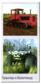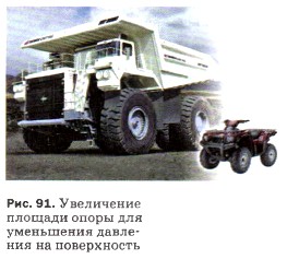 Тяжёлый гусеничный трактор производит на почву давление 40—50 кПа, т. е. всего в 2—3 раза больше, чем давление мальчика массой 45 кг. Это объясняется тем, что вес трактора распределяется на большую площадь. А мы установили, что чем больше площадь опоры, тем меньше давление, производимое одной и той же силой на эту опору. В зависимости от того, хотят ли получить малое или большое давление, площадь опоры увеличивают или уменьшают. Например, для того чтобы грунт мог выдержать давление возводимого здания, увеличивают площадь нижней части фундамента. Шины грузовых автомобилей и шасси самолётов делают значительно шире, чем легковых (рис. 91). Особенно широкими делают шины у автомобилей, предназначенных для передвижения в пустынях.