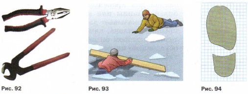 Упражнение 151. Рассмотрите устройство плоскогубцев и клещей (рис. 92). При помощи какого инструмента можно произвести большее давление на зажатое тело, действуя одинаковой силой? 2. Для спасения человека, провалившегося под лёд, ему бросают широкую доску, не приближаясь к краю полыньи (рис. 93). Зачем? 3. Зачем под гайку подкладывают широкое металлическое кольцо — шайбу. Почему шайба особенно необходима при скреплении болтами деревянных частей?