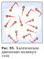 Известно, что молекулы газа беспорядочно движутся. При своём движении они сталкиваются друг с другом, а также со стенками сосуда, в котором находится газ (рис. 95). Молекул в газе много, потому и число их ударов очень велико. Например, число ударов молекул воздуха, находящегося в комнате, о поверхность площадью 1 см2 за 1 с выражается двадцатитрёхзначным числом. Хотя сила удара отдельной молекулы мала, но действие всех молекул на стенки сосуда значительно, оно и создаёт давление газа. Итак, давление газа на стенки сосуда (и на помещённое в газ тело) вызывается ударами молекул газа.