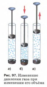 Попытаемся уменьшить объём газа, но так, чтобы масса его осталась неизменной. Это значит, что в каждом кубическом сантиметре газа молекул станет больше, плотность газа увеличится. Тогда число ударов молекул о стенки сосуда возрастёт, т. е. возрастёт давление газа. Это можно подтвердить опытом. На рисунке 97, а изображена стеклянная трубка, один конец которой закрыт тонкой резиновой плёнкой. В трубку вставлен поршень. При вдвигании поршня объём воздуха в трубке уменьшается, т. е. газ сжимается (рис. 97, б). Резиновая плёнка при этом выгибается наружу, указывая на то, что давление воздуха в трубке увеличилось. Наоборот, при увеличении объёма этой же массы газа число молекул в каждом кубическом сантиметре уменьшится. От этого уменьшится число ударов о стенки сосуда — давление газа станет меньше. Действительно, при вытягивании поршня из трубки объём воздуха увеличивается, плёнка прогибается внутрь сосуда (рис. 97, в). Это указывает на уменьшение давления воздуха в трубке. Такие же явления наблюдались бы, если бы вместо воздуха в трубке находился любой другой газ. Итак, при уменьшении объёма газа его давление увеличивается, а при увеличении объёма давление уменьшается при условии, что масса и температура газа остаются неизменными.