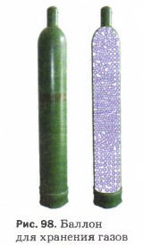 А как изменится давление газа, если нагреть его при постоянном объёме? Известно, что скорость движения молекул газа при нагревании увеличивается. Двигаясь быстрее, молекулы будут ударять о стенки сосуда чаще. Кроме того, каждый удар молекулы о стенку сосуда станет сильнее. Вследствие этого стенки сосуда будут испытывать большее давление. Следовательно, давление газа в закрытом сосуде тем больше, чем выше температура газа, при условии, что масса газа и объём не изменяются. Из этих опытов можно сделать общий вывод, что давление газа тем больше, чем чаще и сильнее молекулы ударяют о стенки сосуда. Для хранения и перевозки газов их сильно сжимают. При этом давление их возрастает, газы приходится заключать в специальные, очень прочные стальные баллоны (рис. 98). В таких баллонах, например, содержат сжатый воздух в подводных лодках, кислород, используемый при сварке металлов. Вопросы1. Какие свойства газов отличают их от твёрдых тел и жидкостей?