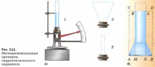 Это утверждение, хотя оно нами обосновано и подтверждено опытом, всё же кажется неправдоподобным — парадоксальным. Однако ничего парадоксального в нём нет, и его можно объяснить законом Паскаля. Рассмотрим рисунок 111, б. На площадку MN дна сосуда действует сила, равная весу столба жидкости KMNL, которая производит давление рgh. По закону Паскаля такое давление передаётся и на площадки AM и NB. Тогда сила, действующая на всё дно АВ, будет равна весу вертикального столба жидкости ABDC. Эта сила больше веса жидкости в сосуде 3 (см. рис. 111, а), меньше веса жидкости в сосуде 2 и равна весу жидкости в сосуде 1. Представьте себе, что суженную часть сосуда (см. рис. 111, б) мы сделаем ещё тоньше и длиннее. Тогда совсем небольшим количеством воды мы сможем создать большое давление на дно. Таким опытом поразил своих современников в 1648 г. Паскаль. В прочную, наполненную водой и закрытую со всех сторон бочку он вставил узкую трубку и, поднявшись на балкон второго этажа дома, вылил в эту трубку кружку воды. Давление на стенки бочки так возросло, что планки (клёпки) бочки разошлись и вода из бочки стала выливаться.