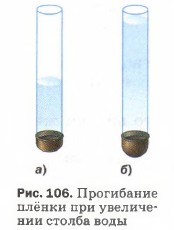 На жидкости, как и на все тела на Земле, действует сила тяжести. Поэтому каждый слой жидкости, налитой в сосуд, своим весом создаёт давление на другие слои, которое по закону Паскаля передаётся по всем направлениям. Следовательно, внутри жидкости существует давление. В этом можно убедиться на опыте. В стеклянную трубку, нижнее отверстие которой закрыто тонкой резиновой плёнкой, нальём воду. Под действием веса жидкости дно трубки прогнётся (рис. 106, а). Опыт показывает, что чем выше столб воды над резиновой плёнкой, тем больше она прогибается (рис. 106, б). Но всякий раз после того, как резиновое дно прогнулось, вода в трубке приходит в равновесие (останавливается), так как, кроме силы тяжести, на воду действует сила упругости растянутой резиновой плёнки.
