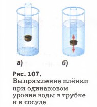 Опустим трубку с резиновым дном, в которую налита вода, в другой, более широкий сосуд с водой (рис. 107, а). Мы увидим, что по мере опускания трубки резиновая плёнка постепенно выпрямляется. Полное выпрямление плёнки показывает, что силы, действующие на неё сверху и снизу, равны (рис. 107, б). Наступает полное выпрямление плёнки тогда, когда уровни воды в трубке и сосуде совпадают. Такой же опыт можно провести с трубкой, в которой резиновая плёнка закрывает боковое отверстие, как это показано на рисунке 108, а. Погрузим эту трубку с водой в другой сосуд с водой, как это изображено на рисунке 108, б. Мы заметим, что плёнка снова выпрямится, как только уровни воды в трубке и в сосуде сравняются. Это означает, что силы, действующие на резиновую плёнку, одинаковы с обеих сторон.