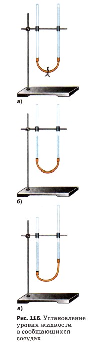 На рисунке 116 изображены два сосуда, соединённые между собой резиновой трубкой. Такие сосуды называют сообщающимися. Лейка, чайник, кофейник — примеры сообщающихся сосудов (рис. 117). Из опыта мы знаем, что вода, налитая, например, в лейку, стоит всегда в резервуаре лейки и в боковой трубке на одном уровне. С сообщающимися сосудами можно проделать следующий простой опыт. В начале опыта (рис. 116, а) резиновую трубку в середине зажимают и в одну из трубок наливают воду. Затем зажим открывают, и вода начинает перетекать в другую трубку до тех пор, пока поверхности воды в обеих трубках не установятся на одном уровне (рис. 116, б). Можно закрепить одну из трубок в штативе, а другую поднимать, опускать или наклонять в стороны. И в этом случае, как только жидкость успокоится, её уровни в обеих трубках будут одинаковыми (рис. 116, в). В сообщающихся сосудах любой формы и сечения поверхности однородной жидкости устанавливаются на одном уровне (при условии, что давление воздуха над жидкостью одинаково) (рис. 118). Это можно обосновать следующим образом. Жидкость покоится, не перемещаясь из одного сосуда в другой (см. рис. 116). Значит, давления в обоих сосудах на любом уровне одинаковы. Жидкость в обоих сосудах одна и та же, т. е. имеет одинаковую плотность. Следовательно,