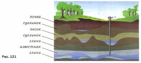 2. На рисунке 121 изображён артезианский колодец в разрезе. Почва, суглинок и песок легко пропускают воду. Глина и известняк, наоборот, водонепроницаемы. Объясните действие такого колодца.