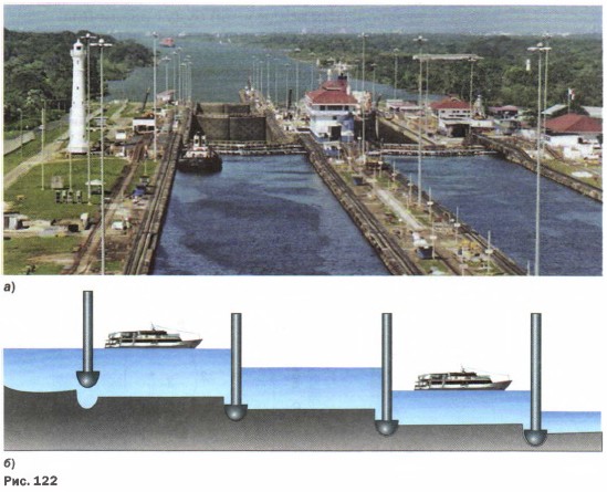 Примером сообщающихся сосудов могут служить шлюзы, которые воздвигают для прохода судов в обход плотин гидроэлектростанций, или каналы, соединяющие реки (рис. 122). Если в один из сообщающихся сосудов налить жидкость одной плотности, а во второй — другой, то при равновесии уровни этих жидкостей не будут одинаковыми. И это понятно. Мы ведь знаем, что давление жидкости на дно сосуда прямо пропорционально высоте столба и плотности жидкости. А в этом случае плотности жидкостей различны, поэтому высоты столбов этих жидкостей будут различны. При равенстве давлений высота столба жидкости с большей плотностью будет меньше высоты столба жидкости с меньшей плотностью (рис. 119). Вопросы1. Какие примеры сообщающихся сосудов вы можете привести?