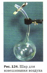 На опыте покажем, как определить массу воздуха. Для этого можно взять прочный стеклянный шар с пробкой и резиновой трубкой с зажимом (рис. 124). Выкачаем насосом из него воздух, зажмём трубку зажимом и уравновесим на весах. Затем, открыв зажим на резиновой трубке, впустим в шар воздух. Равновесие весов при этом нарушится. Для его восстановления придётся положить на другую чашку весов гири, масса которых и будет равна массе воздуха в объёме шара. Опытами установлено, что при температуре 0 °С и нормальном атмосферном давлении масса воздуха объёмом 1 м3 равна 1,29 кг. Вес этого воздуха легко вычислить: