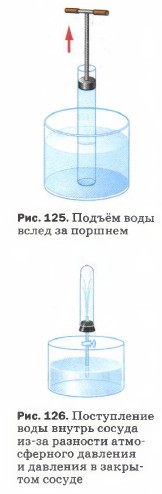 Вследствие действия силы тяжести верхние слои воздуха, подобно воде океана, сжимают нижние слои. Воздушный слой, прилегающий непосредственно к Земле, сжат больше всего и, согласно закону Паскаля, передаёт производимое на него давление по всем направлениям. В результате этого земная поверхность и тела, находящиеся на ней, испытывают давление всей толщи воздуха, или, как обычно говорят, испытывают атмосферное давление. Существованием атмосферного давления могут быть объяснены многие явления, с которыми мы встречаемся в жизни. (Например, мыльница и крючок на присосках, пипетка, шприц.) Рассмотрим некоторые из них. На рисунке 125 изображена стеклянная трубка, внутри которой находится поршень, плотно прилегающий к стенкам трубки. Конец трубки опущен в воду. Если поднимать поршень, то за ним будет подниматься и вода. Происходит это потому, что при подъёме поршня между ним и водой образуется безвоздушное пространство. В это пространство под давлением наружного воздуха и поднимается вслед за поршнем вода. Это явление используется в водяных насосах и некоторых других устройствах. На рисунке 126 показан цилиндрический сосуд. Сосуд закрыт пробкой, в которую вставлена трубка с краном. Из сосуда насосом откачивают воздух. Затем конец трубки погружают в воду. Если теперь открыть кран, то вода фонтаном брызнет внутрь сосуда. Вода поступает в сосуд потому, что атмосферное давление больше давления разреженного воздуха в сосуде. Вопросы1. Как можно определить массу воздуха?