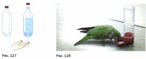 3. Напольная поилка для птиц (рис. 128) состоит из бутылки, наполненной водой и опрокинутой в корытце так, что горлышко находится немного ниже уровня воды в корытце. Почему вода не выливается из бутылки? Если уровень воды в корытце понизится и горлышко бутылки выйдет из воды, часть воды из бутылки выльется. Почему? Изготовьте такой прибор и проделайте с ним указанные опыты. 4. На рисунке 129 изображён прибор ливер, служащий для взятия проб различных жидкостей. Ливер опускают в жидкость, затем закрывают пальцем верхнее отверстие и вынимают из жидкости. Когда верхнее отверстие открывают, из ливера начинает вытекать жидкость. Проделайте опыт и объясните действие этого прибора.