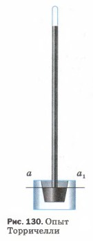 Рассчитать атмосферное давление по формуле для вычисления давления столба жидкости (§ 39) нельзя. Для такого расчёта надо знать высоту атмосферы и плотность воздуха. Но определённой границы у атмосферы нет, а плотность воздуха на разной высоте различна. Однако измерить атмосферное давление можно с помощью опыта, предложенного в XVII в. итальянским учёным Эванджелиста Торричелли, учеником Галилея. Опыт Торричелли состоит в следующем: стеклянную трубку длиной около 1 м, запаянную с одного конца, наполняют ртутью. Затем, плотно закрыв другой конец трубки, её переворачивают, опускают в чашку с ртутью и под ртутью открывают конец трубки (рис. 130). Часть ртути при этом выливается в чашку, а часть её остаётся в трубке. Высота столба ртути, оставшейся в трубке, равна примерно 760 мм. Над ртутью в трубке воздуха нет, там безвоздушное пространство. Торричелли, предложивший описанный выше опыт, дал и его объяснение. Атмосфера давит на поверхность ртути в чашке. Ртуть находится в равновесии. Значит, давление в трубке на уровне ааг (см. рис. 130) равно атмосферному давлению. Если бы оно было больше атмосферного, то ртуть выливалась бы из трубки в чашку, а если меньше, то поднималась бы в трубке вверх.
