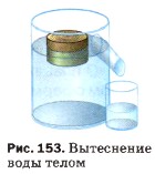 В отливной сосуд наливают воду до уровня боковой трубки. После этого в сосуд погружают плавающее тело (рис. 153), предварительно взвесив его в воздухе. Опустившись в воду, тело вытесняет объём воды, равный объёму погружённой в неё части тела. Взвесив эту воду, находят, что её вес (архимедова сила) равен силе тяжести, действующей на плавающее тело, или весу этого тела в воздухе.