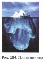 Плавает на поверхности воды и лёд (рис. 154), так как его плотность меньше плотности воды.