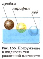 Чем меньше плотность тела по сравнению с плотностью жидкости, тем меньшая часть тела погружена в жидкость (рис. 155).