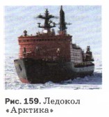 Сейчас для перевозки нефти строят суда водоизмещением 5 000 000 кН (5 • 106 кН) и больше, т. е. имеющие вместе с грузом массу 500 000 т (5 • 105 т) и более. Если из водоизмещения вычесть вес самого судна, то получим грузоподъёмность этого судна. Грузоподъёмность показывает вес груза, перевозимого судном. Судостроение существовало ещё в Древнем Египте, Финикии, Древнем Китае. В России судостроение зародилось на рубеже XVII—XVIII вв. Сооружались главным образом военные корабли, но именно в России были созданы первый ледокол, суда с двигателем внутреннего сгорания, атомный ледокол «Арктика» (рис. 159). Вопросы1 На чём основано плавание судов?