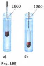 Деления на нём нанесены сверху вниз. Второй (рис. 160, б) — для жидкостей с плотностью большей, чем вода. Деления на нём нанесены снизу вверх. Цифрой 1000 обозначена плотность воды: ρ = 1000 кг/м3. • а) Объясните действие таких приборов. • б) Используя пробирку или деревянную палочку и кусочки свинца, изготовьте ареометры для жидкостей, имеющих плотности большую и меньшую, чем вода. 2. Налейте в стакан воды, введите в воду конец пипетки и выпускайте из неё понемногу воздух. Затем наберите в пипетку немного жидкого масла и пускайте его под водой по капле. Что вы наблюдаете? Сделайте вывод.