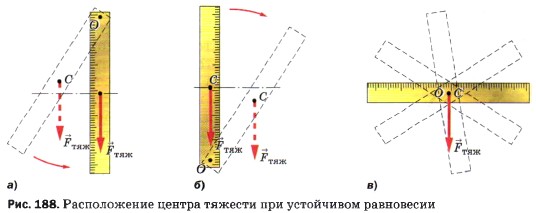 Раздел механики, изучающий условия равновесия тел, называется статикой. Рассмотрим различные случаи равновесия тел, имеющих одну точку опоры. Повесим на гвоздь линейку так, чтобы она заняла положение равновесия (рис. 188, а). Если линейку отклонить в сторону, то под действием силы тяжести она возвратится в прежнее положение. Равновесие, при котором выведенное из положения равновесия тело вновь к нему возвращается, называют устойчивым. При устойчивом равновесии центр тяжести тела расположен ниже оси вращения и находится на вертикальной прямой, проходящей через эту ось. Теперь расположим линейку таким образом, чтобы центр тяжести находился на одной вертикальной линии с точкой опоры, но выше неё (рис. 188, б). Если линейку вывести из положения равновесия, то она больше в начальное положение не вернётся, так как сила тяжести, действующая на линейку, препятствует этому.