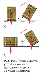 Возьмём призму на шарнирах (рис. 190, а). К центру тяжести призмы прикрепим отвес. Будем постепенно менять форму призмы. Равновесие призмы остаётся устойчивым, пока линия отвеса проходит через площадь опоры. Как только линия отвеса оказывается на границе площади опоры, равновесие становится неустойчивым (рис. 190, б). При незначительном отклонении влево призма опрокидывается. Об устойчивости положения тела можно также судить по величине угла поворота, необходимого для приведения тела в неустойчивое равновесие. Чтобы тело заняло положение неустойчивого равновесия, его надо повернуть вокруг оси, проходящей через линию опоры. Чем больше угол α, на который нужно для этого повернуть тело (рис. 191), тем устойчивее первоначальное положение тела. Величина угла поворота, а следовательно, и устойчивость тела зависят от размеров площади, на которую оно опирается, и от положения его центра тяжести. Вопросы1. Какое равновесие называют устойчивым?
