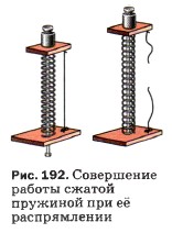 Слово «энергия» употребляется нередко и в быту. Так, например, людей, которые могут быстро выполнять большую работу, называют энергичными, обладающими большой энергией. Что же такое энергия? Чтобы ответить на этот вопрос, рассмотрим примеры. Сжатая пружина, распрямляясь, может совершить работу, например поднять на высоту груз (рис. 192) или заставить двигаться тележку. Поднятый над землёй неподвижный груз не совершает работы, но если этот груз упадёт, то он совершит работу (например, может забить в землю сваю). Способностью совершить работу обладает и всякое движущееся тело. Так, скатившийся с наклонной плоскости стальной шарик А (рис. 193), ударившись о деревянный брусок B, передвигает его на некоторое расстояние. При этом совершается работа. Если тело или несколько взаимодействующих между собой тел (система тел) могут совершить работу, то говорят, что они обладают энергией.