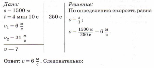 6*. Для любознательных следует уточнить, что рассмотренные примеры равномерного движения относились только к движению вдоль прямой линии. Поэтому точнее было бы говорить о равномерном прямолинейном движении, поскольку равномерным может быть движение не только вдоль прямой. Так, стрелки часов движутся равномерно, но по окружности. В этой главе вы будете изучать только равномерное прямолинейное движение. 7. Пример решения задачи Может ли человек перегнать ветер, если известно, что спортивную дистанцию 1500 м он пробегает за 4 мин 10 с? Скорость умеренного ветра примерно 6 м/с, а скорость ветра при шторме примерно 21 м/с. Прежде чем решать задачу, обратите внимание на единицы времени движения человека. В таких случаях следует привести время к одинаковым единицам, лучше секундам, так как секунда — основная единица времени. 4 мин 10 с = 4 • 60 с + 10 с = 250 с. Введём обозначения: υ — скорость бегущего человека; υ1 — скорость умеренного ветра; υ2 — скорость штормового ветра. Вспомним, что путь обозначается буквой s, время — буквой t. Запись условия задачи и её решения выполняется следующим образом: