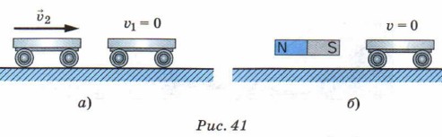 Глава 1. Механические явления § 15. ИнерцияКакое движение называют равномерным; равноускоренным? Приведите примеры действия одного тела на другое. 1. В предыдущих параграфах мы не выясняли, по каким причинам в одних случаях тело движется равномерно, в других — его скорость меняется. Как показывают многочисленные эксперименты и наш повседневный опыт, скорость тела может изменяться только под действием на него другого тела или тел. Например, движущаяся тележка на демонстрационном столе, автомобиль с выключенным двигателем на шоссе или поезд обязательно остановятся. Причина этого явления — действие соприкасающейся с движущимся телом поверхности. Если же тело покоится и скорость его равна нулю, то привести это тело в движение (при этом оно должно приобрести какую-либо скорость) может только другое тело. Так, покоящуюся тележку может привести в движение другая тележка, движущаяся с определённой скоростью (рис. 41, а), или рука человека, или же поднесённый к металлической тележке магнит (рис. 41, б).