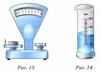 Физическими приборами, хорошо вам известными, являются также секундомер, с помощью которого измеряют время (рис. 12); весы, которые позволяют определить массу тела (рис. 13). Прибором, с помощью которого измеряют объём жидкости, является измерительный цилиндр — мензурка (рис. 14).