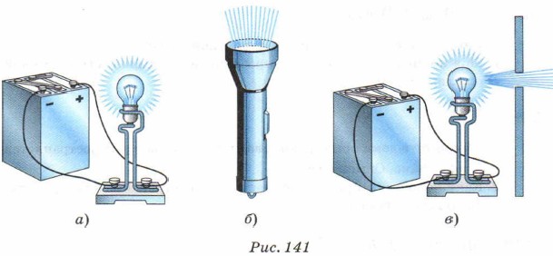 Глава 3. Световые явления § 49. Световой пучок и световой лучКак распространяется свет от лампы накаливания? Зачем светильники обычно имеют абажур? 1. Введём некоторые понятия, которыми будем пользоваться при изучении световых явлений. Для этого проделаем опыт: подключим к источнику тока лампочку на специальной подставке. Свет от лампочки будет распространяться по всем направлениям (рис. 141, а).