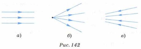 В реальности имеют дело с пучками света, а световой луч показывает направление распространения света и используется для изображения световых пучков. 3. Световые пучки можно выделить с помощью малых отверстий в непрозрачных пластинах, называемых диафрагмами. Они позволяют получать пучки разных размеров и форм. Пучок света может быть параллельным (рис. 142, а), расходящимся (рис. 142, б) и сходящимся (рис. 142, в).