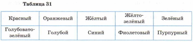Глава 3. Световые явления § 63. Сложение спектральных цветовПочему наблюдается разложение света в спектр? О чём свидетельствует это явление? 1. Направим на экран с помощью зеркал световые пучки двух простых цветов, они наложатся друг на друга. На экране образуются новые цвета. Это явление называют сложением спектральных цветов. Сложение красного цвета с жёлтым даёт оранжевый цвет, оранжевого цвета с зелёным — жёлтый. При сложении трёх цветов: красного, синего и фиолетового — образуются различные оттенки пурпурного цвета. 2. В ряде случаев при сложении двух спектральных цветов глаз воспринимает белый цвет. Так, белый цвет получается при сложении синего и жёлтого цветов, оранжевого и голубого, красного и голубовато-зелёного. Цвета, дающие при сложении белый цвет, называют дополнительными. Для получения белого света эти цвета нужно складывать в определённых пропорциях. Некоторые сочетания дополнительных цветов приведены в таблице 31.
