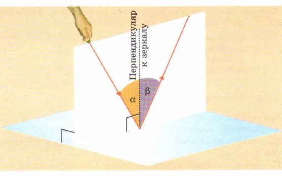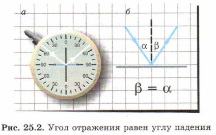 Рис. 25.1. Отражение луча света от зеркала: α — угол падения луча, β — угол отражения луча Угол между падающим лучом и перпендикуляром к зеркалу называют углом падения луча и обозначают греческой буквой α (альфа) (рис. 25.1). А угол между отражённым лучом и перпендикуляром к зеркалу называют углом отражения и обозначают β (бета). Обратите внимание: углы падения и отражения лучей отсчитывают от перпендикуляра к зеркалу. ПОСТАВИМ ОПЫТ Соотношение между углом падения и углом отражения можно установить с помощью оптического диска (рис. 25.2, а).