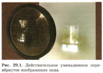 § 29. Изображения, даваемые линзами Изображения, даваемые собирающей линзойДля описанных ниже опытов понадобится собирающая линза с фокусным расстоянием 10—30 см. Действительные изображенияПОСТАВИМ ОПЫТЫ На рис. 29.1 вы видите, как с помощью собирающей линзы можно получить на экране (стене, потолке или листе бумаги) уменьшенное изображение удалённого предмета. Оно является действительным (его можно получить на экране!) и перевёрнутым. Как мы увидим далее, изображение такого типа образуется в глазу и в фотоаппарате.