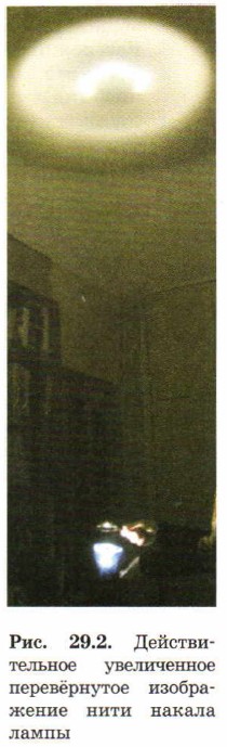 На рис. 29.2 показано, как с помощью собирающей линзы можно получить на экране увеличенное изображение предмета. Увеличение будет особенно большим, когда предмет находится чуть дальше фокуса линзы. Это изображение также является действительным и перевёрнутым. Далее мы увидим, что изображение такого типа возникает на киноэкране.