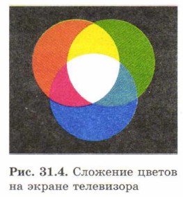 § 31. Цвет Сколько цветов на экране телевизораСвойство глаза «раскладывать» все цвета на красный, зелёный и синий использовали при создании цветных телевизоров и мониторов (дисплеев) компьютеров. ПОСТАВИМ ОПЫТ Нанесите осторожно на экран телевизора капельку воды: она будет служить маленькой и довольно сильной линзой. Сквозь неё вы увидите, что любое цветное изображение на экране состоит из светящихся красных, зелёных и синих точек — то есть точек, имеющих как раз те цвета, к которым наиболее чувствительны колбочки сетчатки глаза. Схематически сложение цветов на экране телевизора показано на рис. 31.4.