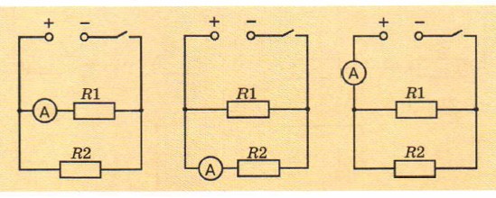 3. Соберите поочерёдно показанные на приведённых далее схемах электрические цепи. После замыкания ключа запишите показания амперметра в каждой из собранных цепей.