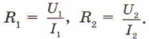 4. Сделайте вывод: как связаны значения силы тока в ветвях цепи (I1 и I2) и сила тока в неразветвлённой части цепи (I) при параллельном соединении проводников. 5. Вычислите сопротивление каждого из резисторов: 6. Вычислите общее сопротивление участка цепи из двух параллельно соединённых резисторов по результатам измерений, используя формулу 7. Сравните полученное значение сопротивления R с рассчитанным по формуле