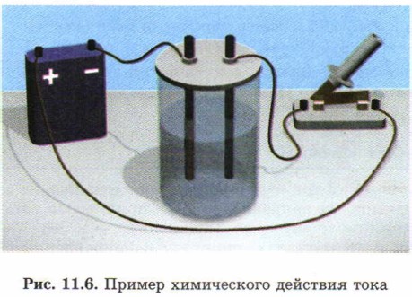 § 11. Электрический ток Действия электрического тока (окончание)Химическое действие токаМы сможем наблюдать его в следующем опыте. ПОСТАВИМ ОПЫТ Опустим в голубоватый раствор медного купороса1 угольные электроды и будем пропускать сквозь раствор электрический ток. Вскоре на электроде, соединённом с отрицательным полюсом источника тока, появится желтоватый налёт: в результате химической реакции начала выделяться медь (рис. 11.6). 1 Сульфат меди (II).