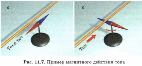 Явление переноса и выделения вещества на электродах при прохождении электрического тока называют электролизом2 . С помощью электролиза никелируют и хромируют изделия, а также получают некоторые металлы, например алюминий. 2 От греческого «литое» — разложимый, растворимый. Магнитное действие токаНачнём снова с опыта. ПОСТАВИМ ОПЫТ Поместим на стол магнитную стрелку и подождём, пока она расположится естественным образом, то есть синий конец стрелки будет указывать на север (рис. 11.7, а). Расположим параллельно стрелке проводник и пропустим по нему ток. Магнитная стрелка повернётся и расположится перпендикулярно проводнику (рис. 11.7, б). Значит, проводник, по которому течёт ток, действует на магнит.