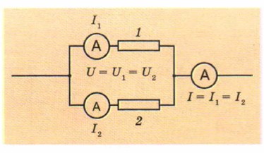 Рис. 12.4. Измерение силы тока в проводниках при параллельном соединении проводников Таким образом,