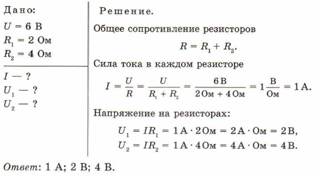 РЕШИМ ЗАДАЧУ К источнику тока напряжением 6 В подключены последовательно два резистора сопротивлениями 2 и 4 Ом. Чему равна сила тока в резисторах и напряжение на каждом из них?